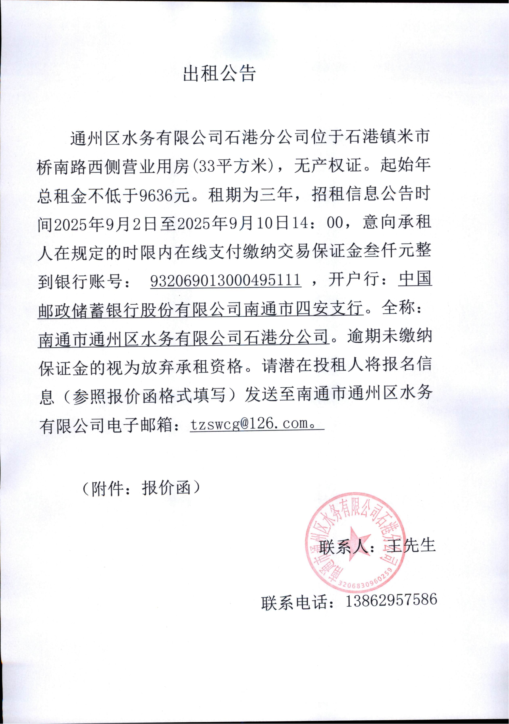 - 南通市通州區(qū)水務有限公司石港分公司米市橋南路西側營業(yè)用房(33平方米)出租公告2025-09-01